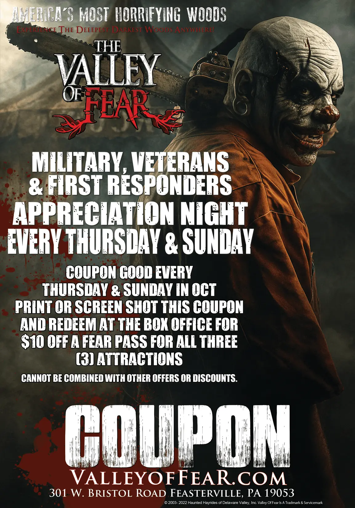 To thank everyone for their service, on those nights Valley of Fear offers $10 off FearPass (all 3 attractions) with proof of active military service (including active guard and reserve) or veteran (flag on driver's license in most states) or proof of active police, fire or EMT service.
